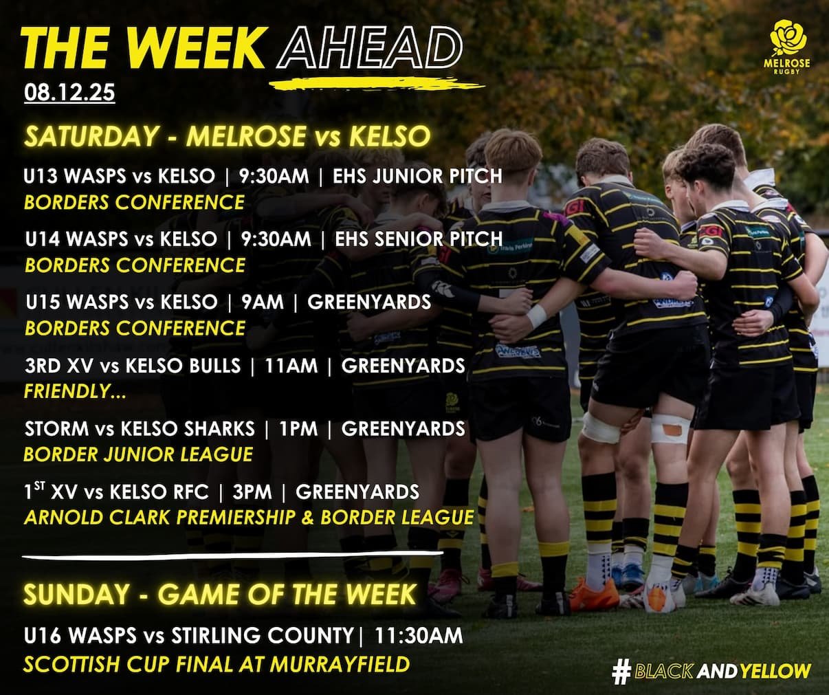 Hope everyone is having a good week and is looking forward to this weekend's rugby! There is certainly a LOT of it! We're going to start with Sunday's rugby and wish our U16 Wasps all the very best for their Cup Final match at Murrayfield against Stirling County. This really is an incredible achievement for the players and their coaches, something we've not seen in about 35 years (I've been informed that it was more than 30 years!) It would be great to have as much support as possible on Sunday, and if you've got a big yellow Melrose flag, please take it with you and make as much noise as possible!! We've also been advised that you don't need a ticket to get in - so just head up the road to Edinburgh and cheer your hearts out for the Wasps! Kick-off is at 11:30am on Murrayfield's hallowed turf!!